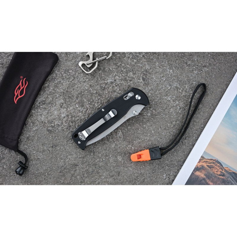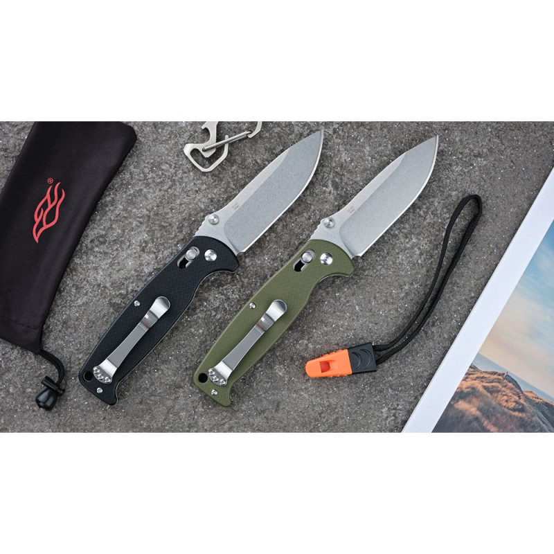 Рукоятка клинка одночасно легка і міцна. Вона зроблена з пластику G10. Покупці можуть вибрати з трьох варіантів забарвлення: чорний, зеленої та помаранчевої. Стиль оформлення — єдиний. Це дві накладки з шорсткою поверхнею, прикручені до сталевій основі. На рукоятці розміщена притискна кліпса темляк-мотузочок, до якого приєднаний свисток.
