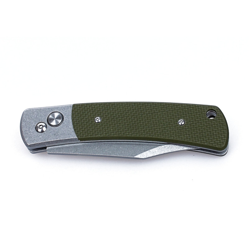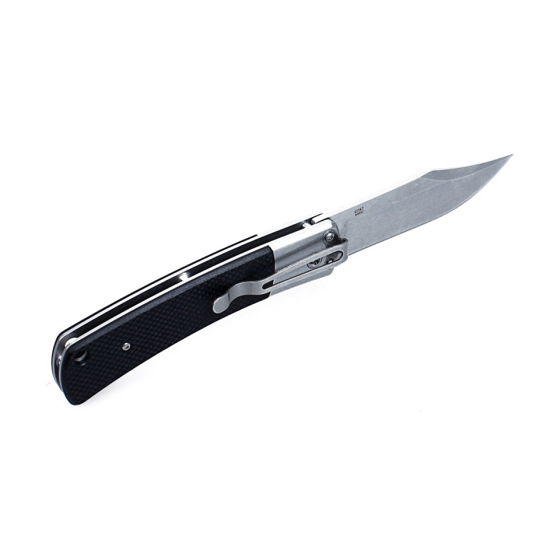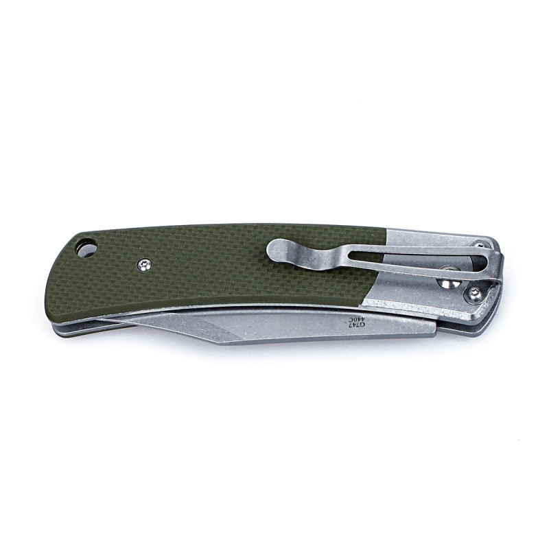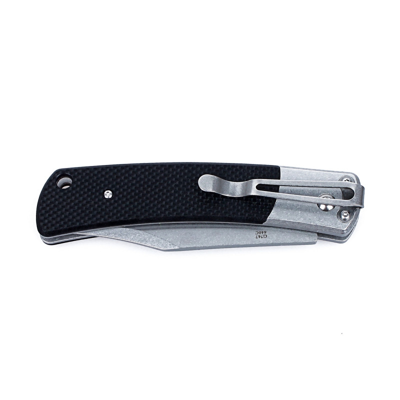Багатофункціональність ножів Ganzo ще раз наочно доводить модель G7472. Це зручний у використанні і привабливий на вигляд складаний ніж,який однаково добре себе проявить і в поїздках на природу, і під час експлуатації в місті. Щоб метал ножа зберігав якості навіть після численних поїздок з ножем на рибалку і в інших умовах постійного зіткнення з водою, для нього вибрана нержавіюча сталь. Виробники віддали перевагу марці 440С. Такий метал отримав одночасно корозійну стійкість і твердість, необхідну для довготривалого збереження заточування. Ріжуча кромка ножа зроблена за універсальним принципом, а тому заточена рівне. Це дозволяє однаково легко розрізати різні за структурою матеріали. Зручна і довжина леза, досягає 92 мм. Міцності ножу додає те, що його товщина в районі обуха дорівнює 0,33 див. Лезо піддалося фінішній обробці методом шліфування великими абразивами. Вона відома під назвою stone-washed. В результаті, клинковая пластина виходить майже матовою і не відбиває падаючі побіжно сонячні промені. Крім того, на відшліфованій таким методом металі практично не видно дрібні дефекти, які неминуче з'являються в ході використання ножа.