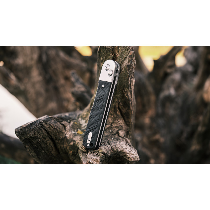Інструмент оснащений замком button lock. Ніж миттєво відкривається натисканням на кнопку та помахом запʼястя. Розташований біля основи клинка ребристий упор для великого пальця покращує контроль над клинком під час виконання силових робіт.