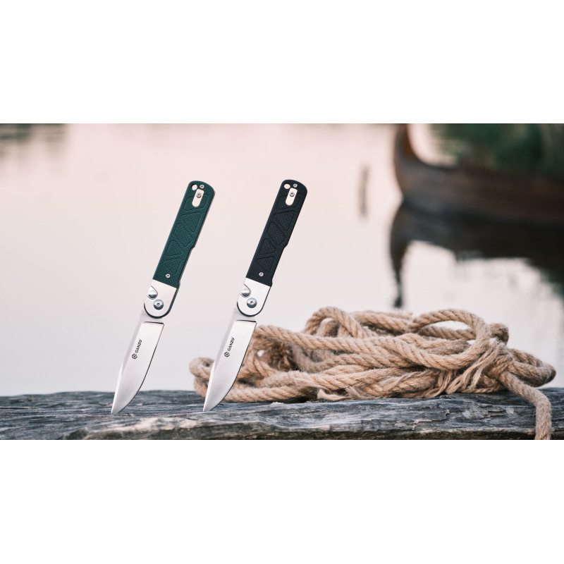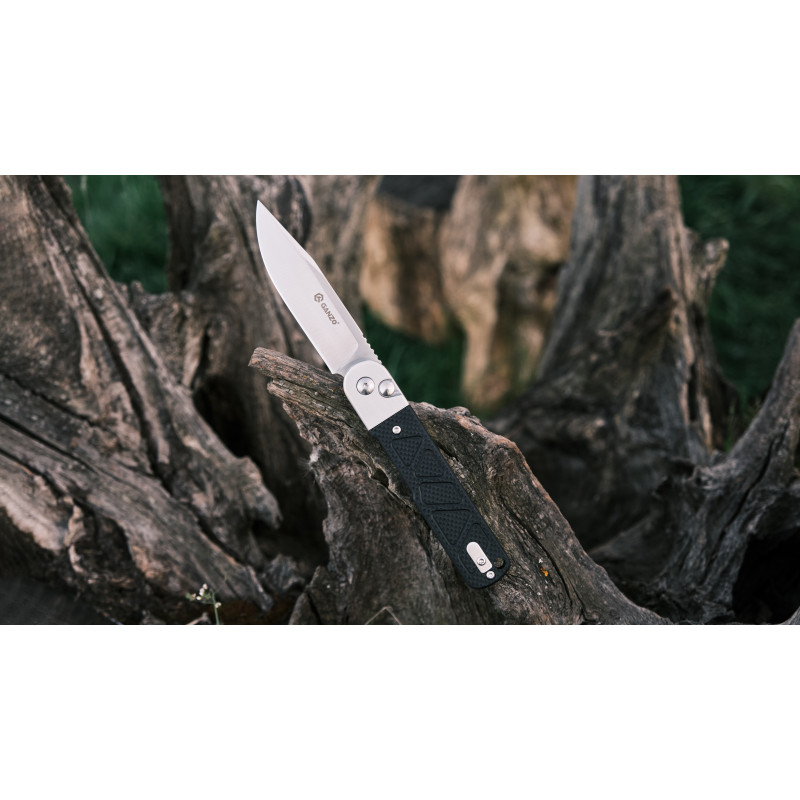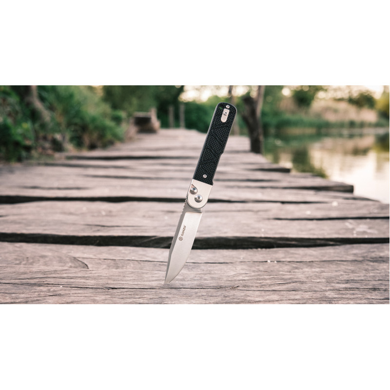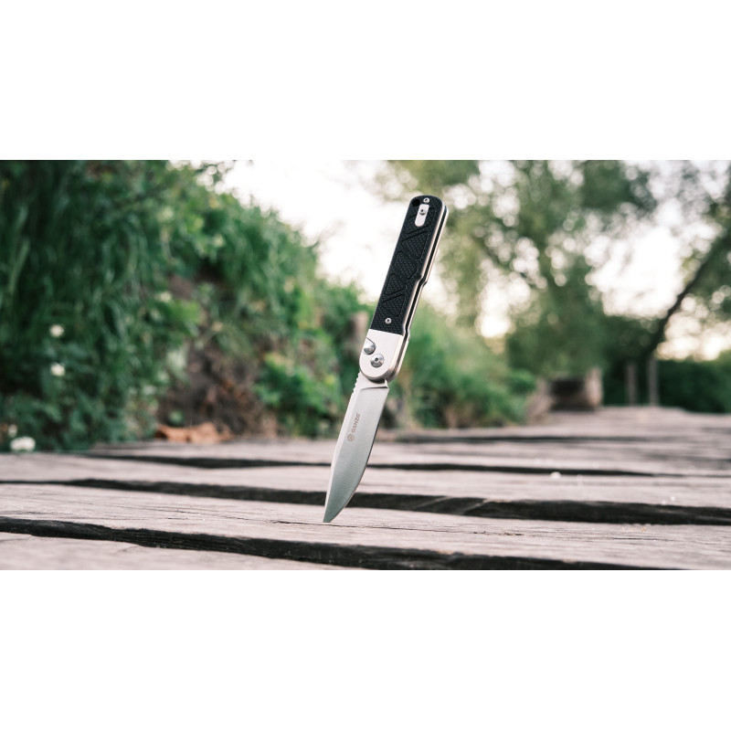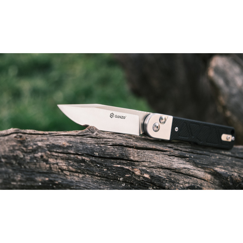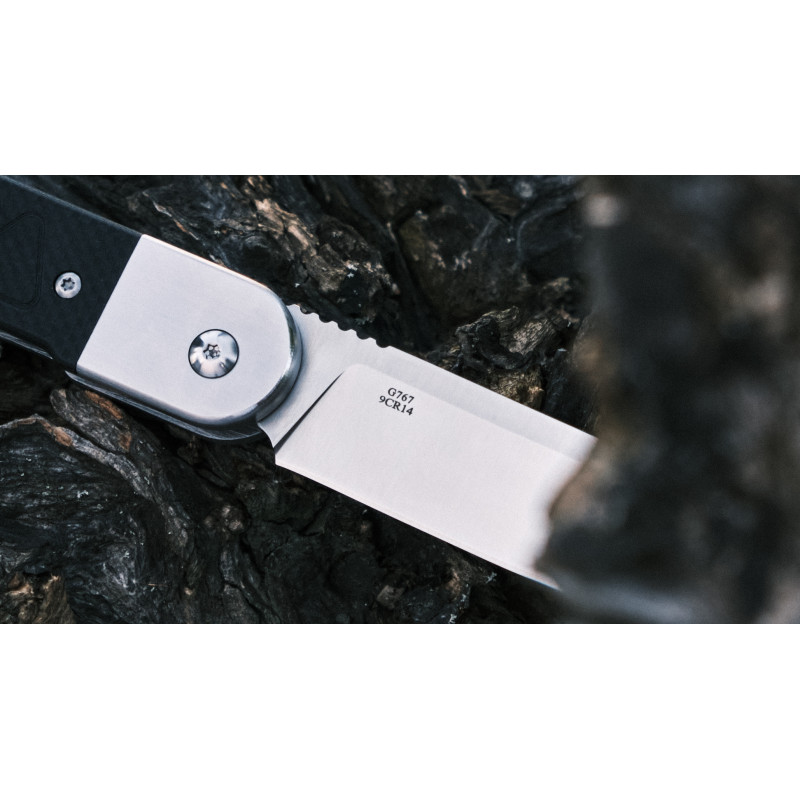 Матеріал клинка — сталь 9CR14, яка рідко зустрічається у складаних інструментах Ganzo. Це нержавіюча марка з високим вмістом хрому та допоміжними легувальними елементами у вигляді молібдену та ванадію, що знижують крихкість та підвищують щільність металу. Твердість сталі дорівнює еталонним 59 HRC, тому клинок ефективно справляється з різанням матеріалів різної щільності.