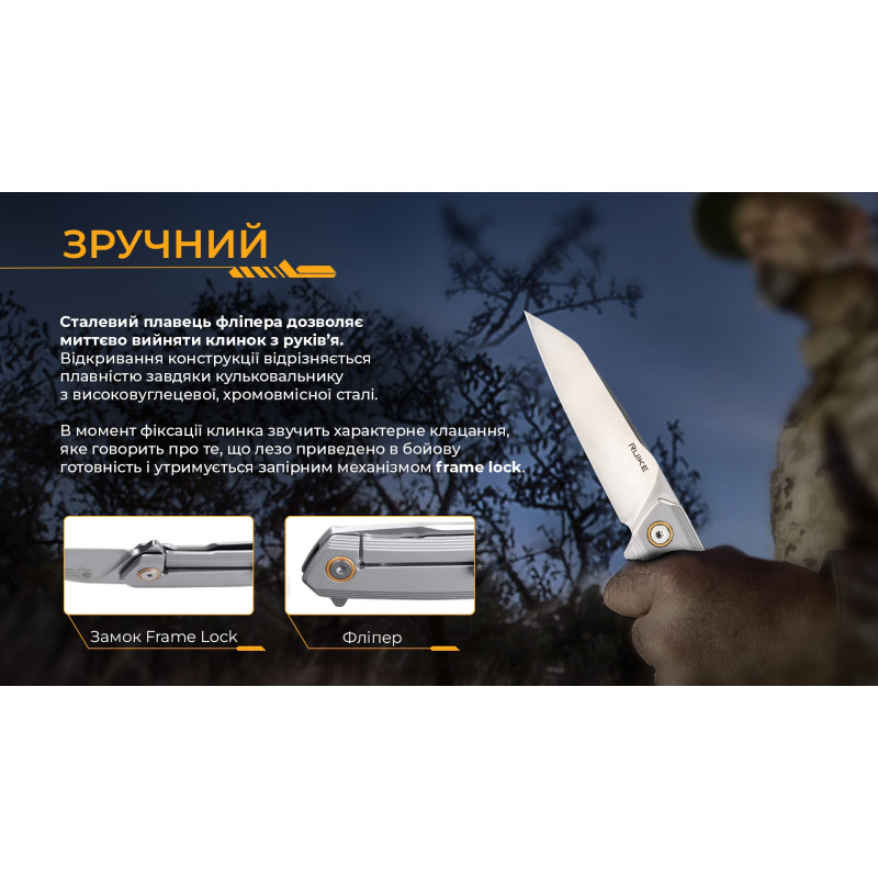 - інструмент відкривається натисканням на сталевий плавець фліпера;