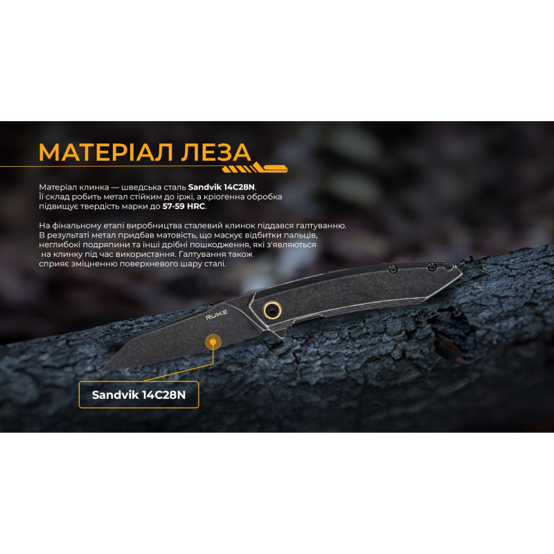 Матеріал клинка — шведська сталь Sandvik 14C28N. Комбінація 14% хрому та 0.1% азоту робить метал стійким до іржі, а кріогенна обробка підвищує твердість марки до 57-59 HRC. На фінальному етапі виробництва сталевий клинок піддався галтуванню. В результаті метал придбав матовість, що маскує відбитки пальців, неглибокі подряпини та інші дрібні пошкодження, які з'являються на клинку під час використання. Галтування також сприяє зміцненню поверхневого шару сталі.