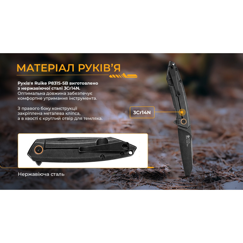 Руківʼя Ruike P831S-SB також виготовлено з нержавіючої сталі, але з іншої марки — 3Cr14N. Довжина руківʼя досягає 110 мм, забезпечуючи комфортне утримання інструмента. З правого боку конструкції закріплена металева кліпса, а в хвості є круглий отвір для темляка. Вага моделі складає 93 грами.
