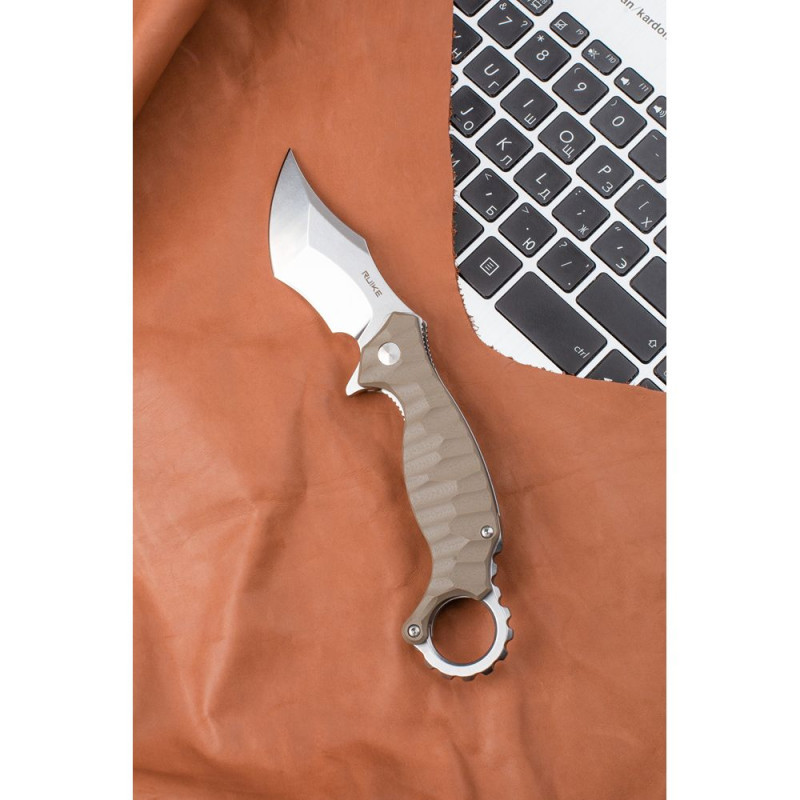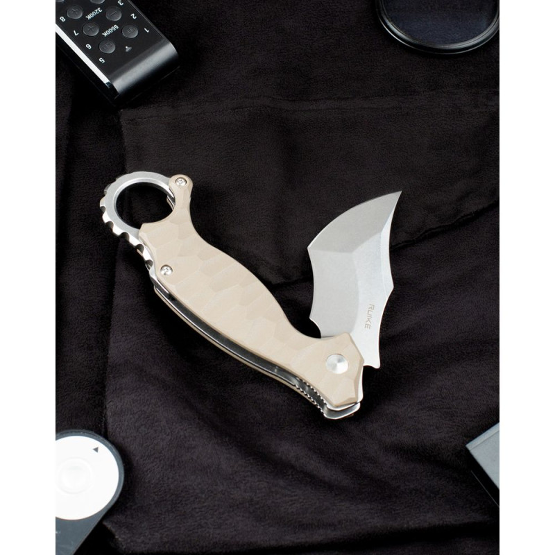 Це можна віднести і до новинки Ruike P881-W. Складаний керамбит має темно-бежевий колір рукояті і довжину в розкритому вигляді 20,2 сантиметри. Забарвлення ножа неоднорідне, з малюнком. Модель має зручну металеву кліпсу, яка дозволяє кріпити ніж на одяг або, приміром, на рюкзак. У виробу є цілий підшипник і замок за типом Liner lock. Цей замок захищає ніж від випадкового відкриття або випадкового закриття. Дуже безпечний і надійний механізм, який значно спростив використання ножів. В результаті відкривати і закривати модель можна буквально однією рукою.