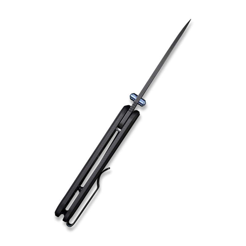 Ніж Weknife Banter 2004B легко відкривається як правою, так і лівою рукою, оскільки шпеник, закріплений на клинку, є двостороннім. Цей елемент виготовлений з титану 6AL4V з синім покриттям, що слугує прикрасою дизайну. Фіксація леза здійснюється замком liner lock.