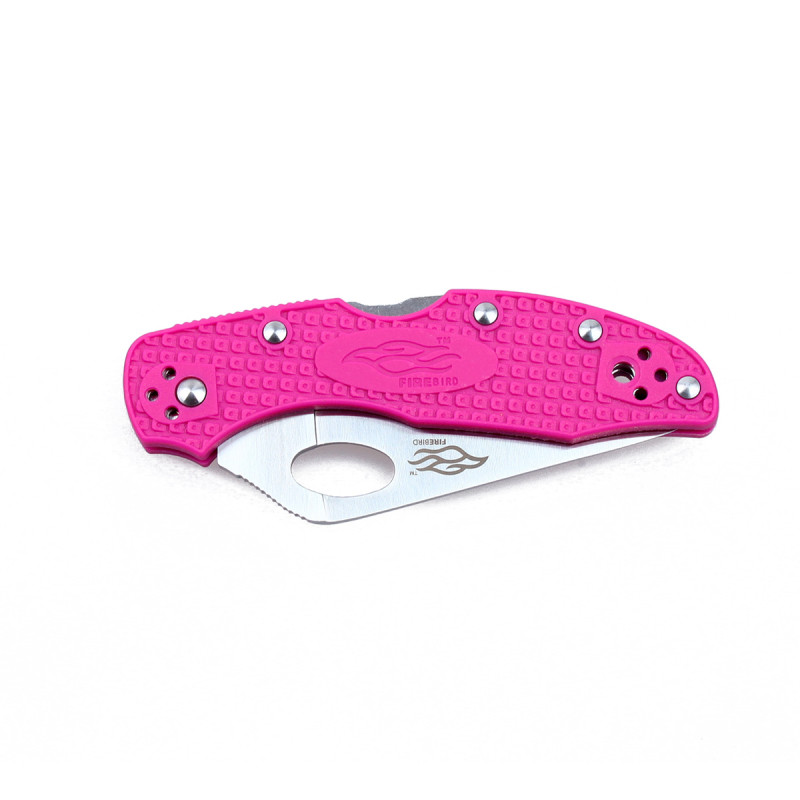 Загальні розміри ножа — 17,5 см, а в складеному вигляді він ще більш компактний, важить 67 грам. Такий ніж точно не здасться важким для того, щоб носити його в кишені. До того ж, він дуже цікаво оформлений і зроблений дуже довговічним. Лезо в даній моделі — нержавіюче. Для нього виробники взяли сталь 440С з показником твердості 58 HRC. Такий метал буде довгий час зберігати відмінний рівень заточування. Враховуючи, що кромка леза Firebird F759M зроблена гладкою, поєднувати її власник ножа зможе і самостійно. Розмір безпосередньо леза становить 75 мм. Помітно розширюється до ручки клинок оброблений на фінішному етапі за методом сатинування, за рахунок чого на його поверхні стають майже непомітними різні відбитки і невеликі подряпини, а значить, довше ніж виглядає зовсім новим. Отвір, який зроблено в лезі служить для відкриття ножа.