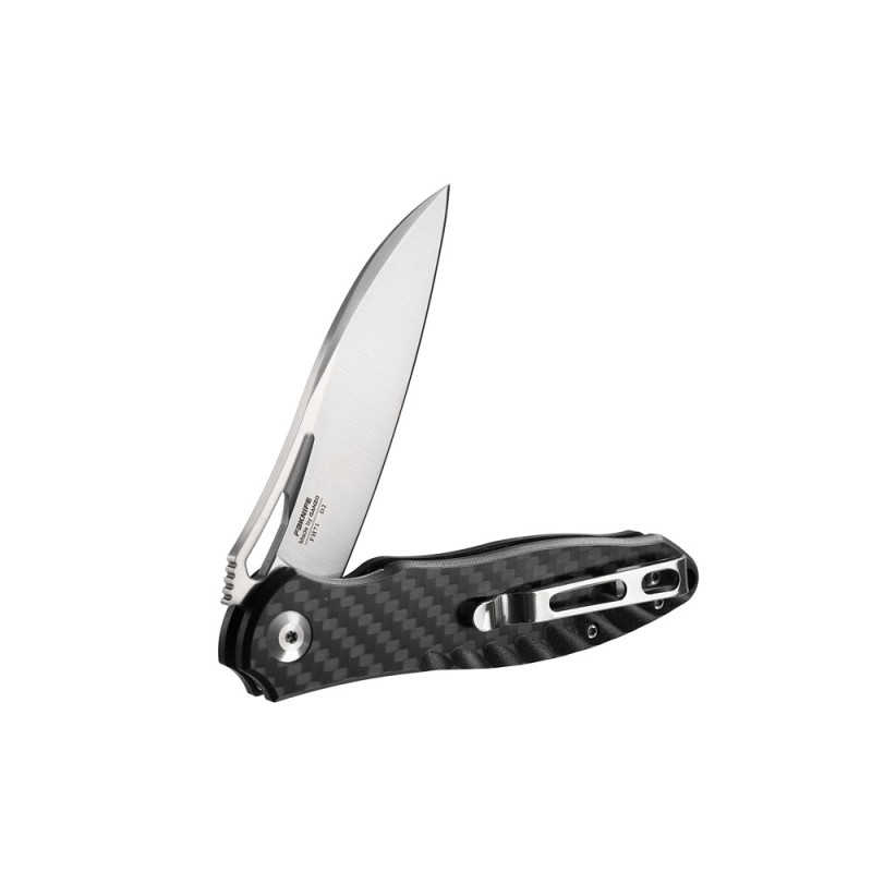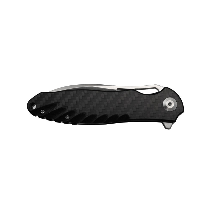Форма леза Drop Point. Це досить популярний тип леза, нерідко він зустрічається серед ножів, особливо ефективний для застосування в полюванні. Ніж з типом клинка Drop Point однаково добре проявляє себе в процесі різання і наколювання. Що до матеріалу рукояті, то в її основі лежить надійне вуглецеве волокно, що відрізняється відмінною міцністю. Також це дуже стійкий до зносу і механічних впливів компонент. З його використанням інструмент стає по-справжньому довговічним, витривалим і захищеним від зовнішніх впливів.