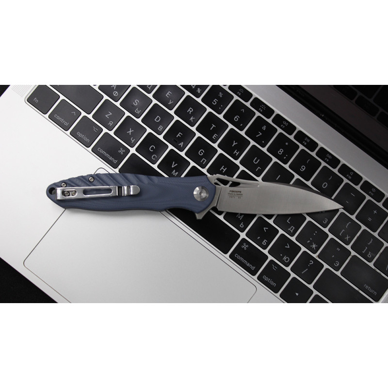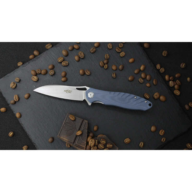 Клинок ножа має сірий колір, його поверхня гладка, лезо типу Drop Point. Дана форма клинка часто зустрічається в ножів. Чималу популярність інструменти з типом леза Drop Point заслужили у мисливців. Вони ефективно ріжуть, і також зручні для уколів. Колючий робота з ножем особливо продуктивна. Лезо новинки зроблено з використанням стали D2, яка досить часто зустрічається серед ножів Firebird. Це сплав високої якості, захищений від дії корозії. Вироби, до складу яких входить такий матеріал, знаходять міцність, надійність, і служать досить довго.