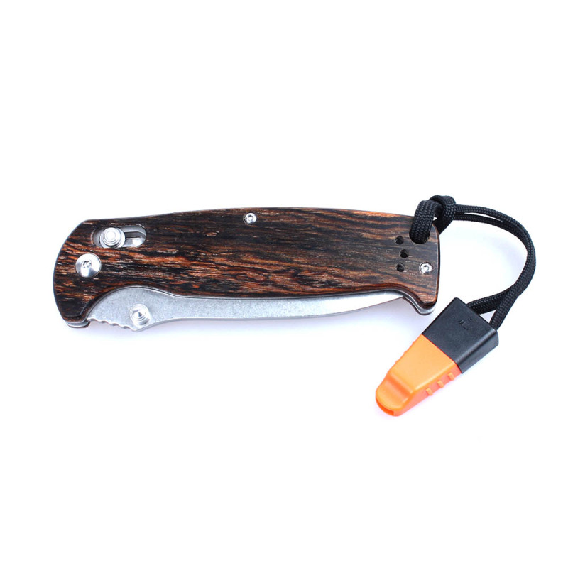 Рукоять оброблена спеціальним складом, щоб дерево не піддавався впливу вологи, не загрязнялось і тривалий час зберігало споконвічну якість. Але на пофарбованій в коричневий колір поверхні добре помітна природна деревна структура волокон. Також для зручності користувачів, до ножа прикріплена сталева притискна кліпса, страхувальний темляк і свисток, з допомогою якого можна подавати сигнали на велику відстань.