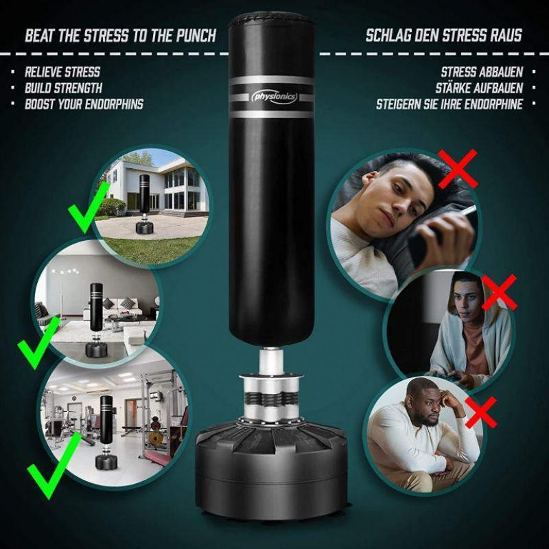 Окремо стоячий боксерський мішок призначений не лише для боксерів, але й ідеальне фітнес-обладнання для всіх спортсменів і любителів спорту, незалежно від того, чи є вони досвідченими у єдиноборствах чи просто хочуть розслабитися після довгого дня в офісі. Завдяки міцній, стабільній основі та надійному пружинному механізму цей боксерський мішок із підставкою є ідеальним рішенням, коли монтаж на стіні чи стелі неможливий. Він має міцну присоску з 12 присосками для встановлення.