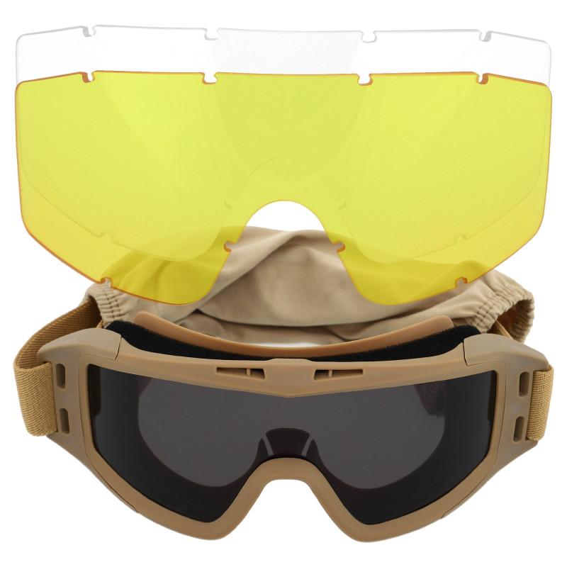 Очки защитные маска со сменными линзами и чехлом тактические мото SPOSUNE JY-023-2 (линзы-PC, оправа-TPU, оправа-хаки, цвет линз серый)