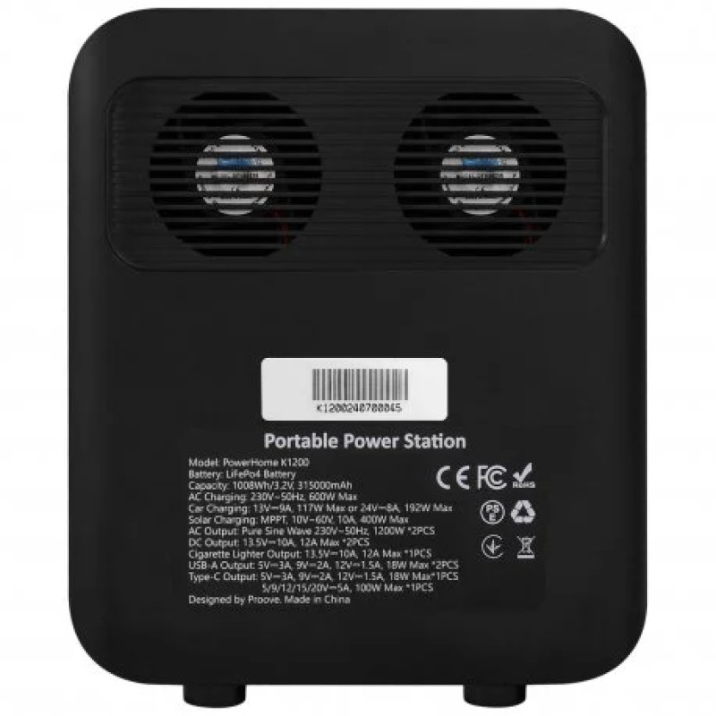 Станція оснащена акумулятором ємністю 315000mAh/1008Wh, що забезпечує тривалу роботу підключених пристроїв. Proove PowerHome K1200 ідеально підходить для живлення різних приладів та гаджетів, гарантуючи стабільну подачу енергії протягом тривалого часу. Вона може використовуватися для підзарядки смартфонів, ноутбуків, освітлювальних приладів та навіть невеликих побутових приладів.
