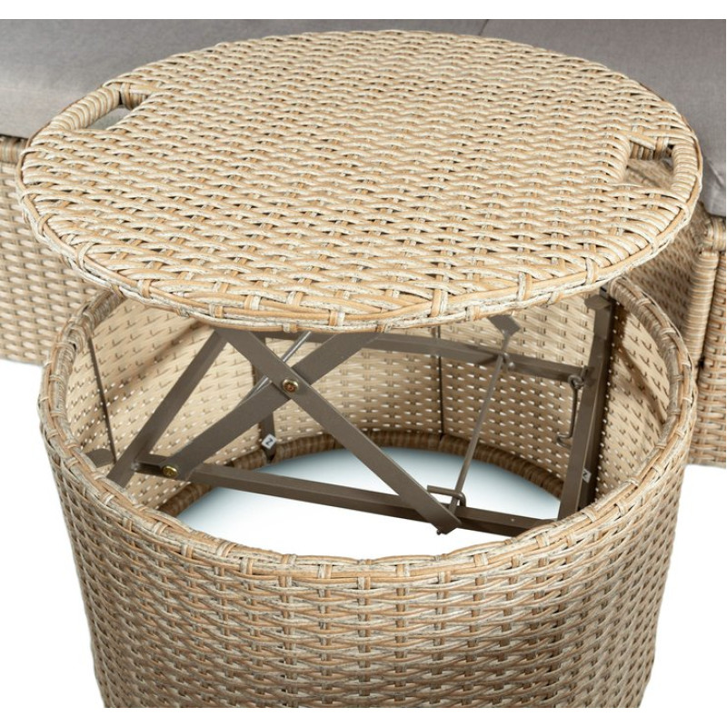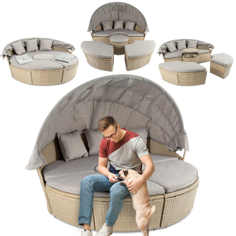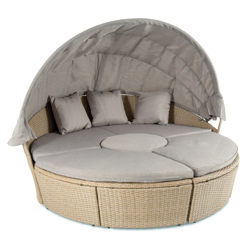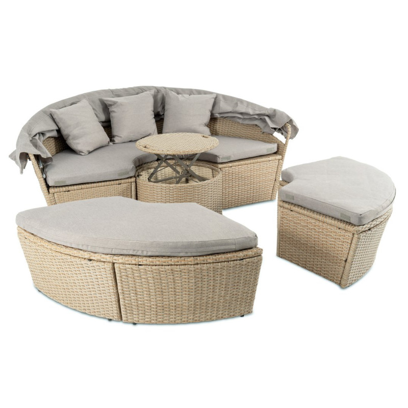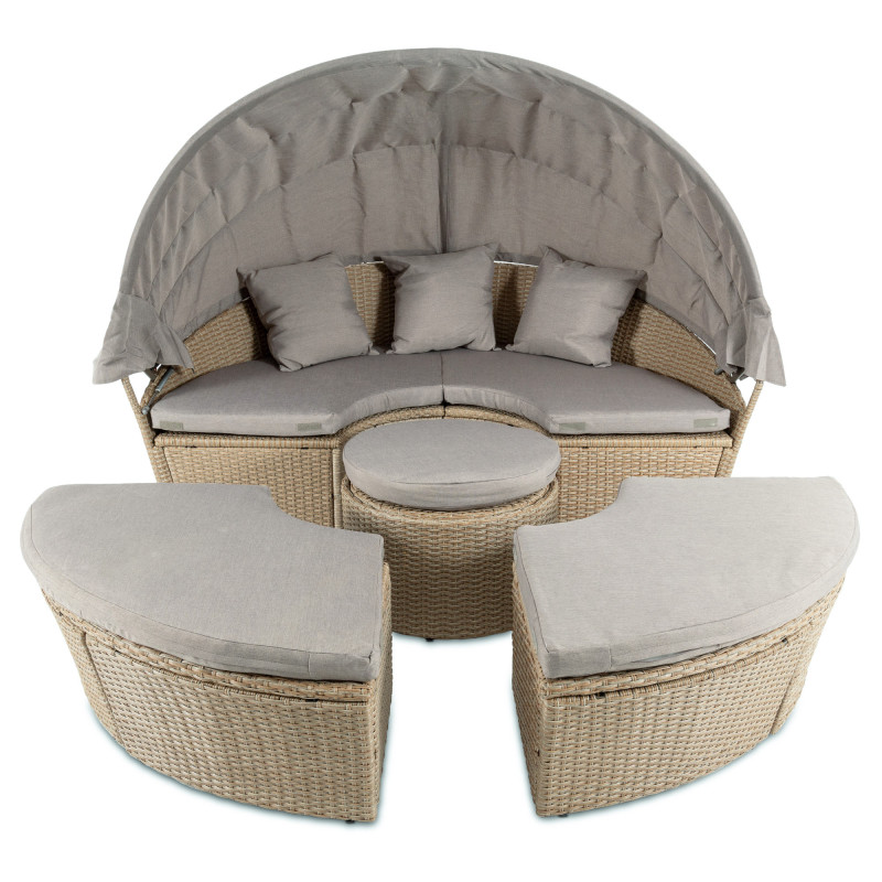 MILANO состоит из пяти независимых модулей, что дает возможность использовать набор в различных конфигурациях - это может быть, например, круглая двуспальная кровать, а также диван со столиком и пуфами. Благодаря поднимающейся крыше, MILANO обеспечивает эффективную защиту не только от сильного солнца, но и от ветра.