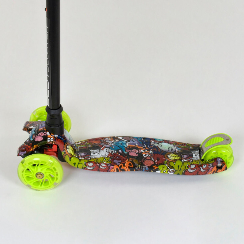 Трехколесный самокат со светящимися колесами от “Best Scooter” предназначен для маленьких любителей активного отдыха. Яркий дизайн данной модели с первого взгляда привлечет внимание малыша и станет любимым транспортным средством!За счет трехколесной конструкции и сдвоенному заднему колесу самокат достаточно устойчив и предотвращает падения во время катания.Пластмассовая дека самоката выполнена из прочного материала и крепится на раму.Т-образный руль имеет прочное металлическое основание. Высота руля фиксируется в 3х положениях. Фигурные грипсы выполнены из резины с рельефными узорами, которые предотвращают соскальзывание ладони с руля во время катания.Наклонная система поворота руля обеспечивает максимально легкое и безопасное управления самокатом. Особенности модели: - яркий и стильный дизайн;- светящиеся колеса;- регулировка высоты руля;- наклонная система поворота руля;- резиновые грипсы;- ножной тормоз на заднем колесе; Характеристики: - полиуретановые колеса;- ширина руля – 26 см;- высота руля регулируется от 77 см до 86 см, с фиксацией в 3х положениях;- размер деки – 55 х 13 см;- размеры колес:передние колеса: диаметр -12см, ширина – 2.4 см;задние колеса: диаметр - 8 см, диаметр – 2.4 см; Материалы: Руль – алюминий;Дека – пластик;Колеса - полиуретан (PU).