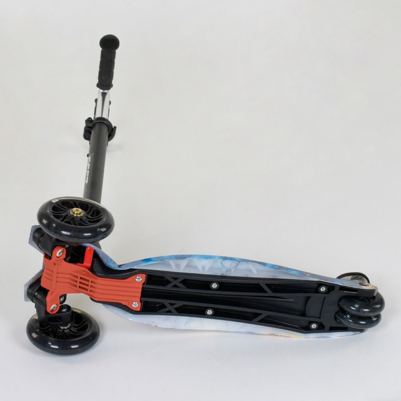 Трехколесный самокат со светящимися колесами от “Best Scooter” предназначен для маленьких любителей активного отдыха. Яркий дизайн данной модели с первого взгляда привлечет внимание малыша и станет любимым транспортным средством!За счет трехколесной конструкции и сдвоенному заднему колесу самокат достаточно устойчив и предотвращает падения во время катания.Пластмассовая дека самоката выполнена из прочного материала и крепится на раму.Т-образный руль имеет прочное металлическое основание. Высота руля фиксируется в 3х положениях. Фигурные грипсы выполнены из резины с рельефными узорами, которые предотвращают соскальзывание ладони с руля во время катания.Наклонная система поворота руля обеспечивает максимально легкое и безопасное управления самокатом. Особенности модели: - яркий и стильный дизайн;- светящиеся колеса;- регулировка высоты руля;- наклонная система поворота руля;- резиновые грипсы;- ножной тормоз на заднем колесе; Характеристики: - полиуретановые колеса;- ширина руля – 26 см;- высота руля регулируется от 77 см до 86 см, с фиксацией в 3х положениях;- размер деки – 55 х 13 см;- размеры колес:передние колеса: диаметр -12см, ширина – 2.4 см;задние колеса: диаметр - 8 см, диаметр – 2.4 см; Материалы: Руль – алюминий;Дека – пластик;Колеса - полиуретан (PU).