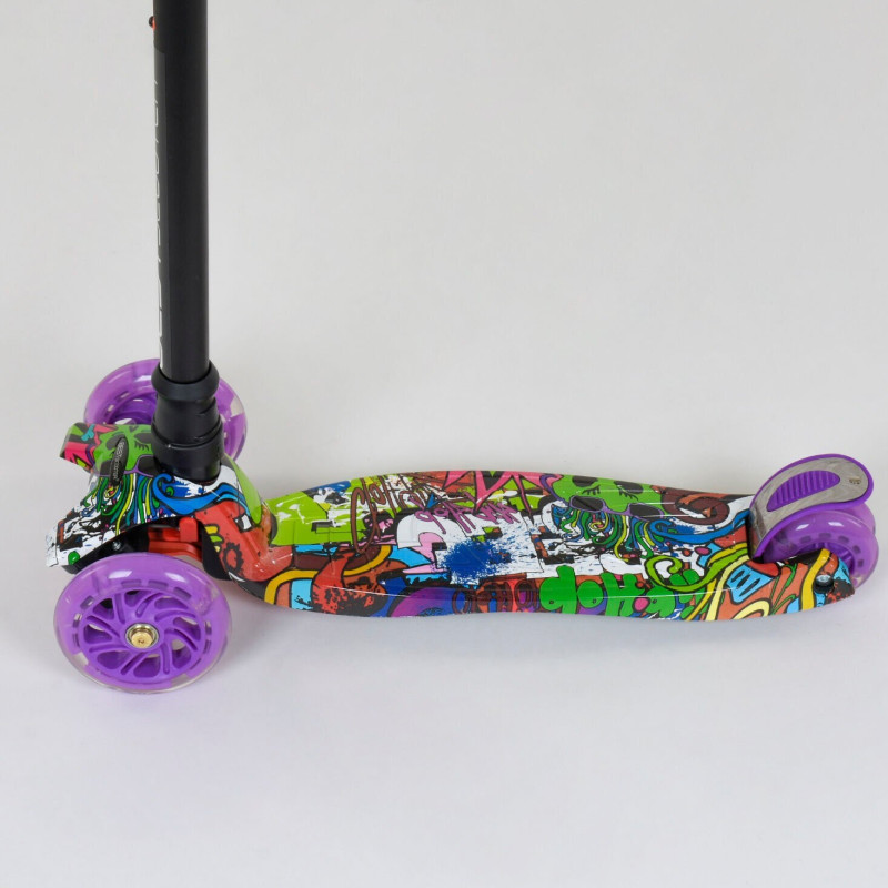 Трехколесный самокат со светящимися колесами от “Best Scooter” предназначен для маленьких любителей активного отдыха. Яркий дизайн данной модели с первого взгляда привлечет внимание малыша и станет любимым транспортным средством!За счет трехколесной конструкции и сдвоенному заднему колесу самокат достаточно устойчив и предотвращает падения во время катания.Пластмассовая дека самоката выполнена из прочного материала и крепится на раму.Т-образный руль имеет прочное металлическое основание. Высота руля фиксируется в 3х положениях. Фигурные грипсы выполнены из резины с рельефными узорами, которые предотвращают соскальзывание ладони с руля во время катания.Наклонная система поворота руля обеспечивает максимально легкое и безопасное управления самокатом. Особенности модели: - яркий и стильный дизайн;- светящиеся колеса;- регулировка высоты руля;- наклонная система поворота руля;- резиновые грипсы;- ножной тормоз на заднем колесе; Характеристики: - полиуретановые колеса;- ширина руля – 26 см;- высота руля регулируется от 77 см до 86 см, с фиксацией в 3х положениях;- размер деки – 55 х 13 см;- размеры колес:передние колеса: диаметр -12см, ширина – 2.4 см;задние колеса: диаметр - 8 см, диаметр – 2.4 см; Материалы: Руль – алюминий;Дека – пластик;Колеса - полиуретан (PU).