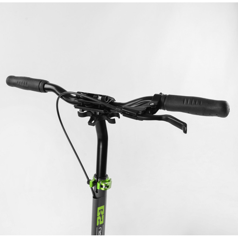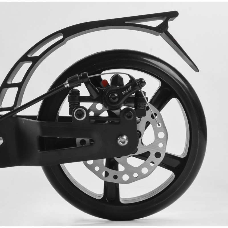 Торможение самоката производится двумя способами: тормозной рукояткой на руле, которая сжимает колодки дискового тормоза на заднем колесе, или же ножным нажатием на крыло заднего колеса.