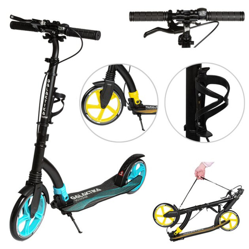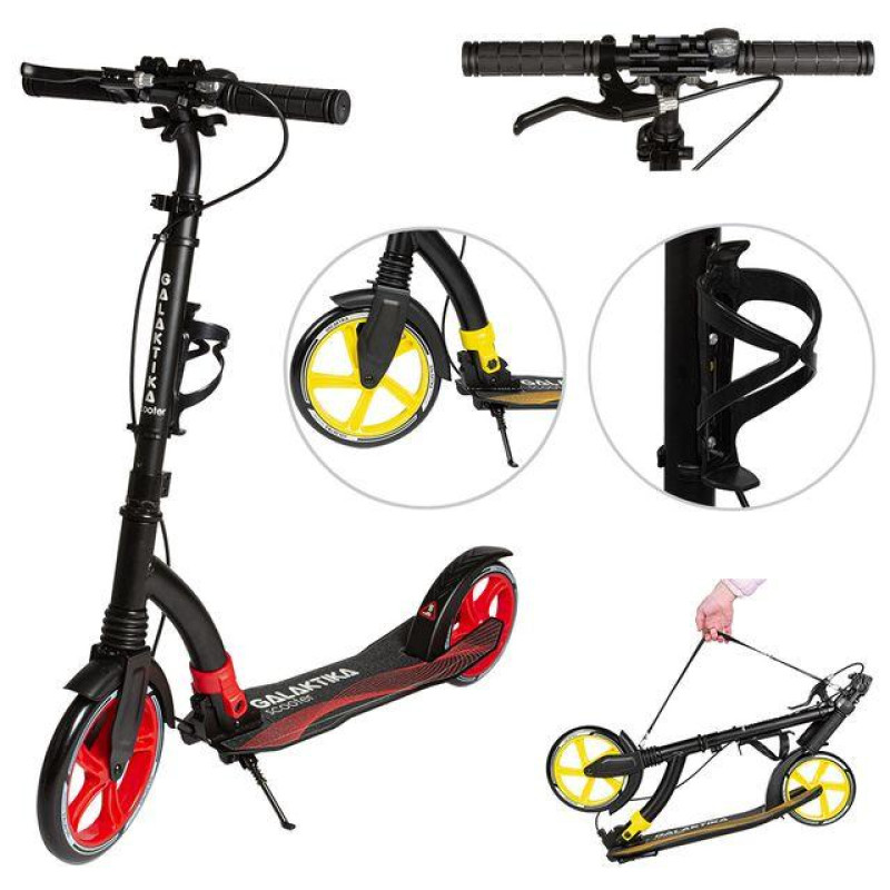 Высота руля регулируется от 86 до 100 см (3 положения), ручки резиновые, зажим на руле, передний амортизатор, складная подножка, ножной тормоз