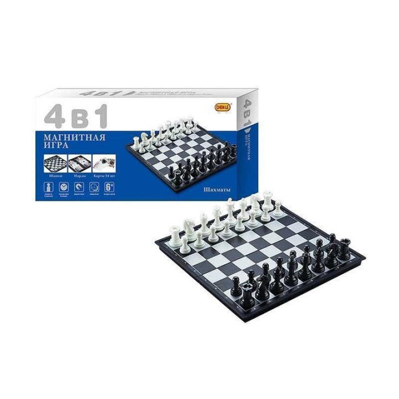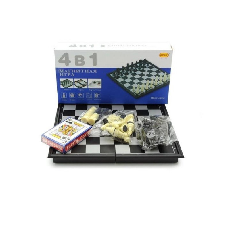 Набор настольных игр 4в1.В комплекте: шахматы, шашки, нарды, игровые карты. Особенности: фигурки магнитятся к полю, так что их можно смело брать с собой в дорогу.