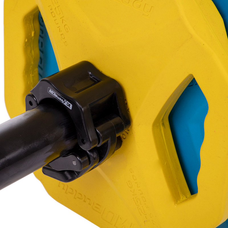 Блины на штанге фиксируются при помощи замков из нейлона повышенной прочности. Они изготовлены в виде хомутов, зажимной механизм которых приводится в действие широким рычагом-клавишей.