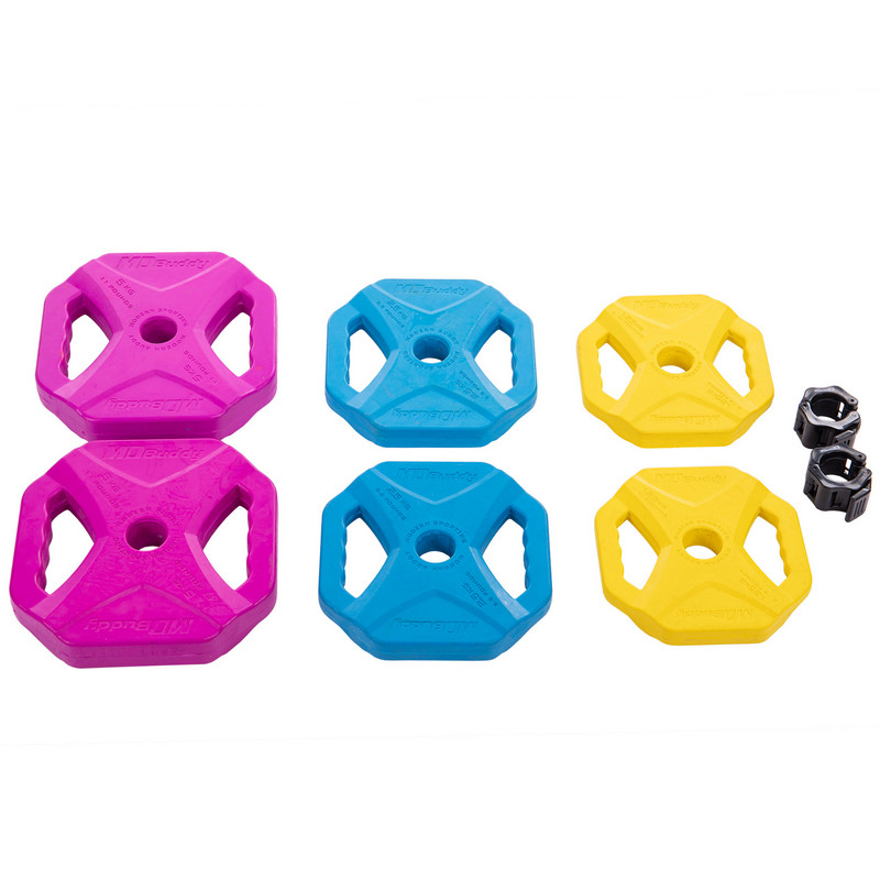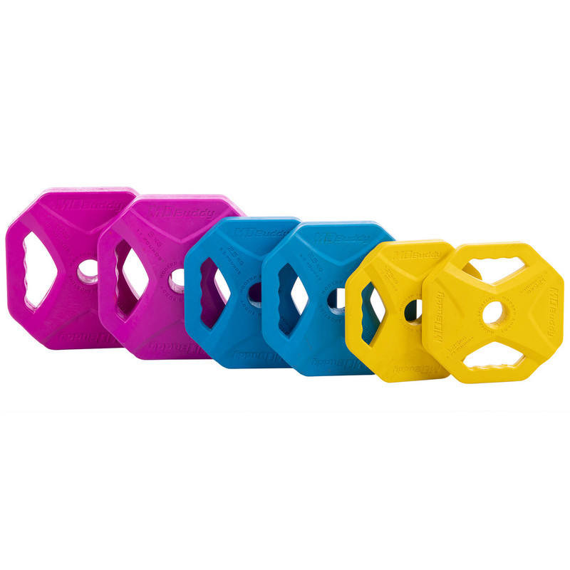 Нагрузочные диски штанги изготовлены из резины на основе синтетического каучука, которая отличается повышенной износоустойчивостью. Имеют форму многогранника – и благодаря этому мягко ложится на пол. Каждый из весов окрашен в свой цвет, чтобы пользователю было легко определять нагрузку.