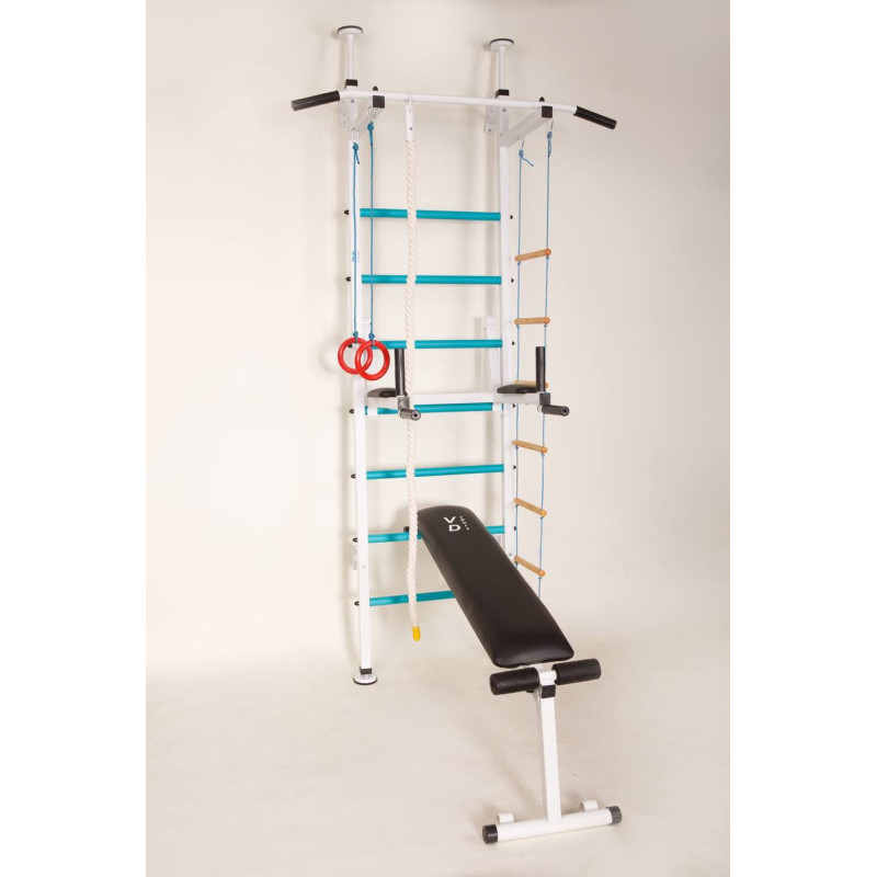 - шведская стенка с внутри металлическими, сверху пластмассовыми перекладинами, стационарный турник с широким хватом (консоли турника приварены к стойкам шведской лестницы)