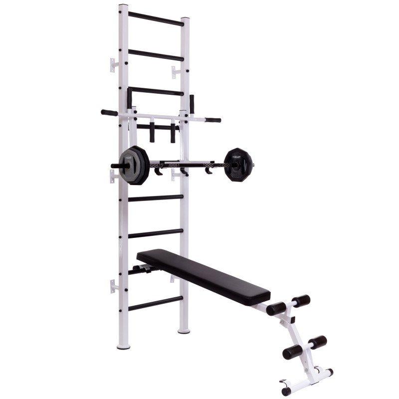 Комплектация: шведская стенка - 1 шт, турник - 1 шт, брусья - 1 шт, скамья для пресса - 1 шт, крепление к стене - 6 шт.