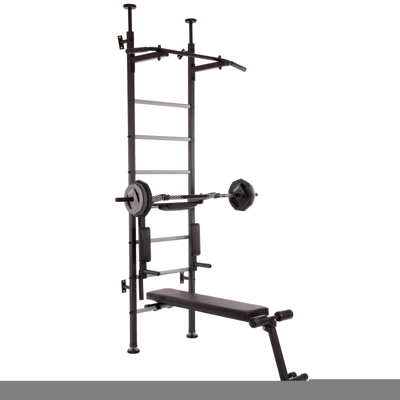 Комплектация: шведская стенка - 1 шт, турник - 1 шт, брусья - 1 шт, скамья для пресса - 1 шт, крепление к стене - 4 шт, крепление в распор - 4 шт.