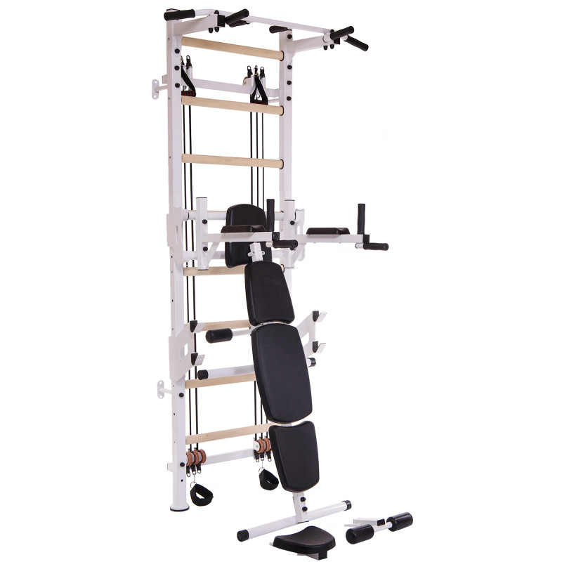 Комплектация: шведская стенка - 1 шт, эспандеры с разной нагрузкой: 14 кг - 1 шт, 16 кг - 1 шт, 18 кг - 1 шт, турник - 1 шт, брусья - 1 шт, скамья для пресса - 1 шт.