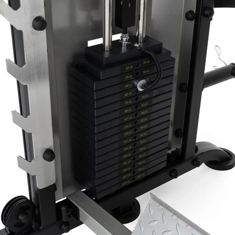 Система противаги, яка складається з двох комплектів вантажів ( по 100 кг з кожного боку ), що дозволяє справді сильним хлопцям піднімати до 200 кг ! На рухомих руках ви можете збільшити опір за допомогою обважнювальних пластин або стрічки опору . Що стосується аксесуарів, то тут є цілих 8 додаткових подовжувачів тросиків і ремінь на щиколотці. Крім того, є тримачі для штанг і запобіжні стопори, знімний ролик з пінопласту , додаткові кілочки для зберігання ваг і стрижень для з’єднання рук для вправ.