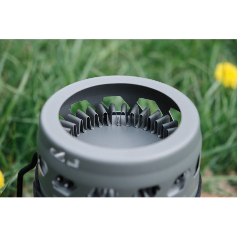 Нижня частина може з'єднуватися з каструлею або її можна видалити. Каструля має зручну ручку для захоплення і щільно закривається кришкою. Матеріал в основі посуду – міцний та стійкий до дії високої температури. Під час процесу горіння виробляється рівне та потужне полум'я. Усі компоненти системи складаються у коробку. Вага в упакованому вигляді становить 590 г.