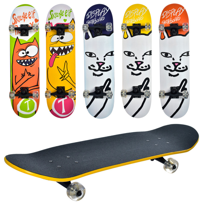 Деревянный Скейтборд MS 0355-4 Profi для начинающих из канадского клена – это скейт, который идеально подойдет новичку для обучения трюков. Легкая и гибкая подвеска выполнена из алюминия с полиуретановыми колесами - диаметр 5 см, подшипники ABEC-7, идеально подходят для первого скейта новичку.