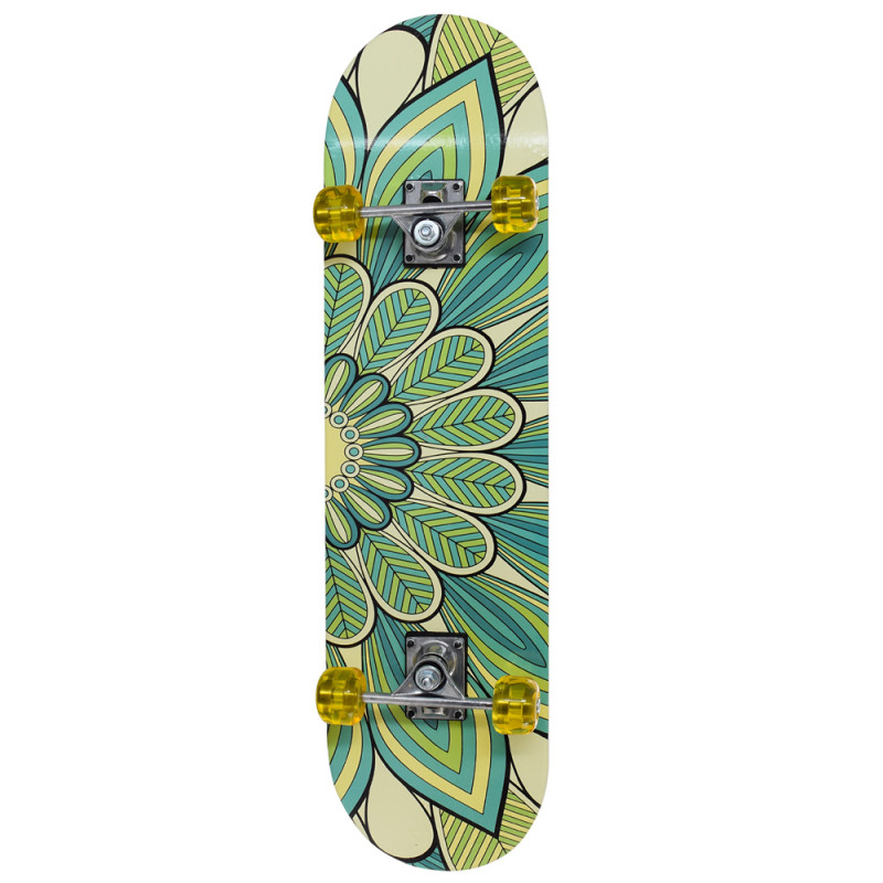 Лицевая сторона скейта покрыта крупной наждачкой, что обеспечивает хорошее сцепление с подошвой и не позволит ноге соскользнуть.
