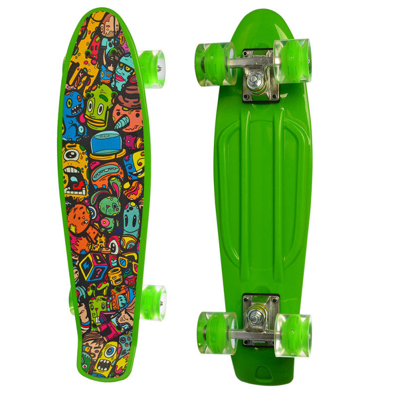 Эта модель имеет длину 55 см и ширину 15 см, материал из которого сделана доска - усиленный пластик и выдерживает нагрузку до 70 кг Поверхность скейта имеет ребристую поверхность, поэтому во время катания нога не будет соскальзывать. Колеса сделанные из полиуретана с подшипниками абек 7 и имеют стандартный диаметр 60 мм. Колеса светятся во время движения, чем быстрее ехать, тем ярче они будут светиться. Светятся они за счет магнитной катушки, расположенной внутри колеса. Подвеска имеет среднюю жесткость, чтобы поворачивать, вам нужно перенести вес тела на ребро скейта вправо или влево Если пенни борд слишком маневренный или наоборот, плохо поворачивает, вы можете отрегулировать его подвеску специальным универсальным ключом.