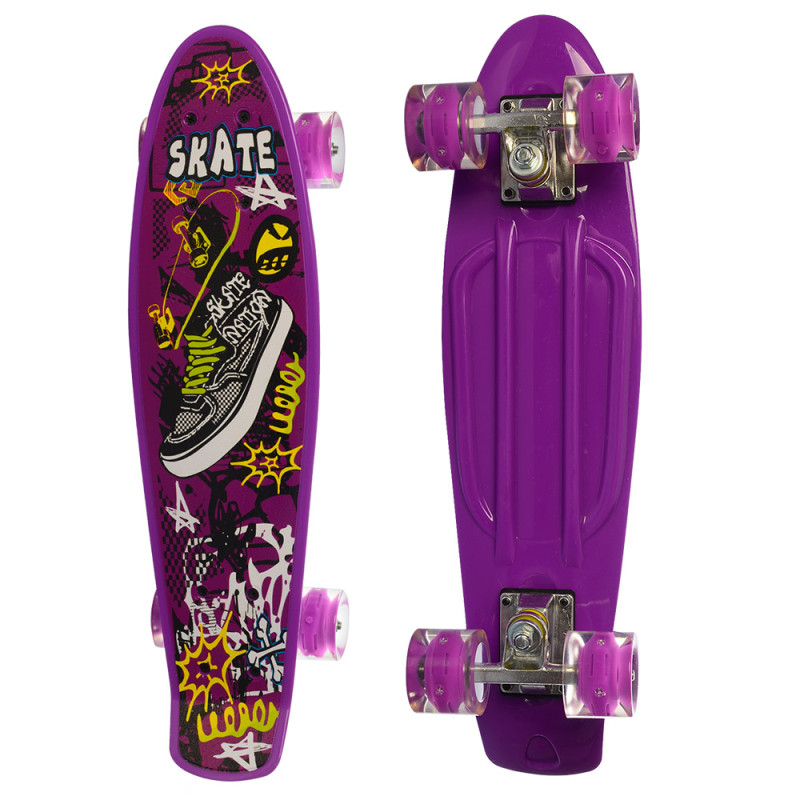 Эта модель имеет длину 55 см и ширину 15 см, материал из которого сделана доска - усиленный пластик и выдерживает нагрузку до 70 кг Поверхность скейта имеет ребристую поверхность, поэтому во время катания нога не будет соскальзывать. Колеса сделанные из полиуретана с подшипниками абек 7 и имеют стандартный диаметр 60 мм. Колеса светятся во время движения, чем быстрее ехать, тем ярче они будут светиться. Светятся они за счет магнитной катушки, расположенной внутри колеса. Подвеска имеет среднюю жесткость, чтобы поворачивать, вам нужно перенести вес тела на ребро скейта вправо или влево Если пенни борд слишком маневренный или наоборот, плохо поворачивает, вы можете отрегулировать его подвеску специальным универсальным ключом.