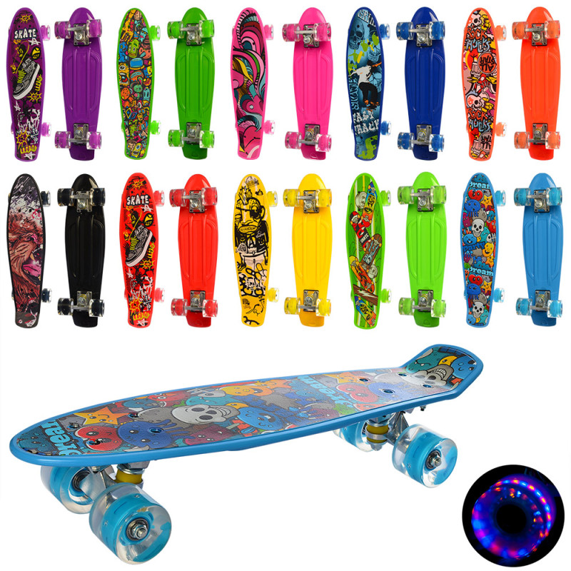 Эта модель имеет длину 55 см и ширину 15 см, материал из которого сделана доска - усиленный пластик и выдерживает нагрузку до 70 кг Поверхность скейта имеет ребристую поверхность, поэтому во время катания нога не будет соскальзывать. Колеса сделанные из полиуретана с подшипниками абек 7 и имеют стандартный диаметр 60 мм. Колеса светятся во время движения, чем быстрее ехать, тем ярче они будут светиться. Светятся они за счет магнитной катушки, расположенной внутри колеса. Подвеска имеет среднюю жесткость, чтобы поворачивать, вам нужно перенести вес тела на ребро скейта вправо или влево Если пенни борд слишком маневренный или наоборот, плохо поворачивает, вы можете отрегулировать его подвеску специальным универсальным ключом.