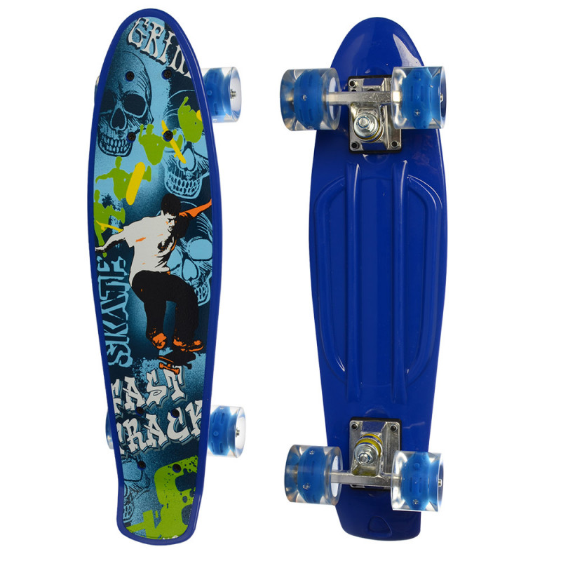 Эта модель имеет длину 55 см и ширину 15 см, материал из которого сделана доска - усиленный пластик и выдерживает нагрузку до 70 кг Поверхность скейта имеет ребристую поверхность, поэтому во время катания нога не будет соскальзывать. Колеса сделанные из полиуретана с подшипниками абек 7 и имеют стандартный диаметр 60 мм. Колеса светятся во время движения, чем быстрее ехать, тем ярче они будут светиться. Светятся они за счет магнитной катушки, расположенной внутри колеса. Подвеска имеет среднюю жесткость, чтобы поворачивать, вам нужно перенести вес тела на ребро скейта вправо или влево Если пенни борд слишком маневренный или наоборот, плохо поворачивает, вы можете отрегулировать его подвеску специальным универсальным ключом.