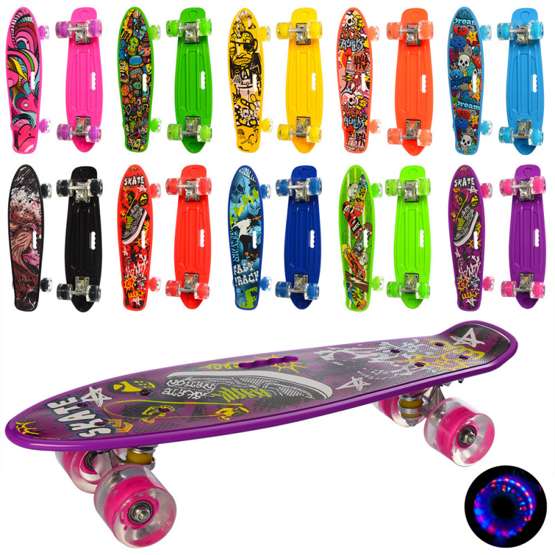 Эта модель имеет длину 55 см и ширину 15 см, материал из которого сделана доска - усиленный пластик и выдерживает нагрузку до 70 кг Поверхность скейта имеет ребристую поверхность, поэтому во время катания нога не будет соскальзывать. Колеса сделанные из полиуретана с подшипниками абек 7 и имеют стандартный диаметр 60 мм. Колеса светятся во время движения, чем быстрее ехать, тем ярче они будут светиться. Светятся они за счет магнитной катушки, расположенной внутри колеса. Подвеска имеет среднюю жесткость, чтобы поворачивать, вам нужно перенести вес тела на ребро скейта вправо или влево Если пенни борд слишком маневренный или наоборот, плохо поворачивает, вы можете отрегулировать его подвеску специальным универсальным ключом.