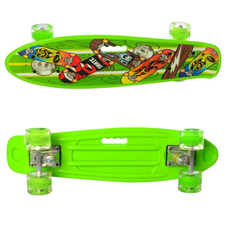 Эта модель имеет длину 55 см и ширину 15 см, материал из которого сделана доска - усиленный пластик и выдерживает нагрузку до 70 кг Поверхность скейта имеет ребристую поверхность, поэтому во время катания нога не будет соскальзывать. Колеса сделанные из полиуретана с подшипниками абек 7 и имеют стандартный диаметр 60 мм. Колеса светятся во время движения, чем быстрее ехать, тем ярче они будут светиться. Светятся они за счет магнитной катушки, расположенной внутри колеса. Подвеска имеет среднюю жесткость, чтобы поворачивать, вам нужно перенести вес тела на ребро скейта вправо или влево Если пенни борд слишком маневренный или наоборот, плохо поворачивает, вы можете отрегулировать его подвеску специальным универсальным ключом.