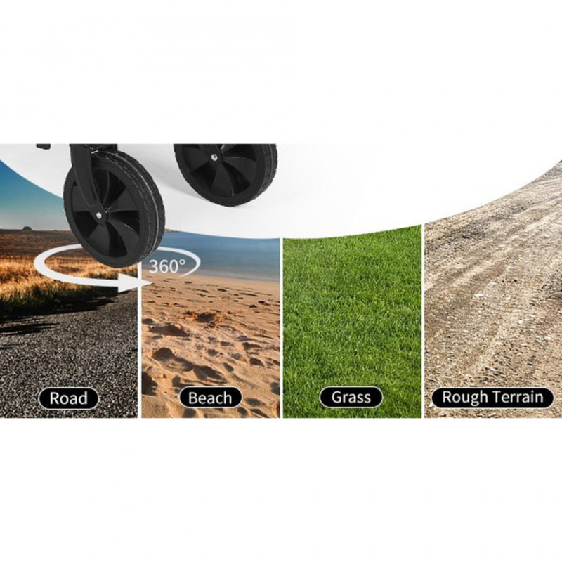 Візочок Naturehike є універсальним для будь-якого зросту — кут нахилу ручки регулюється на 90°. Колесики обертаються на 360° і мають нековзну поверхню для легкого подолання складного, нерівного ландшафту, високої трави, піску та доріжок з гравієм.