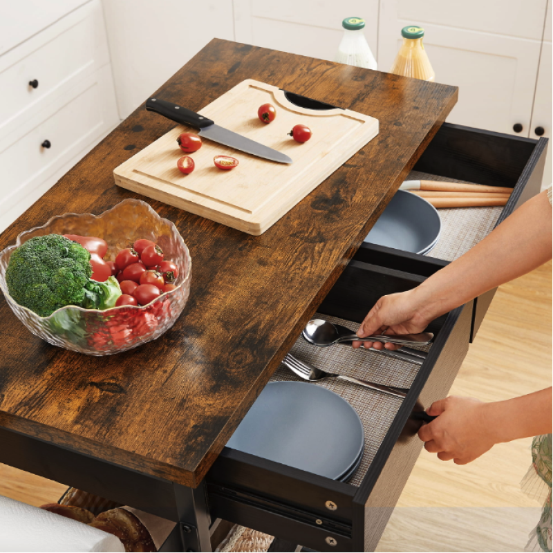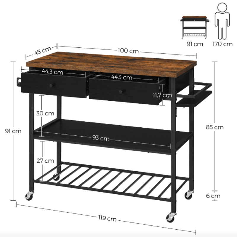 Стеллаж-тележка Leobert Cosmo в стиле Loft - это настоящее произведение искусства для вашей кухни! Представьте себе: просторная, светлая кухня, где каждый предмет находится на своем месте, а вы легко и без труда перемещаете все необходимые вещи именно туда, где они вам нужны. Ваша кухня - это сердце вашего дома, место, где собирается семья, где творятся кулинарные шедевры и где чувствуется тепло и уют. И этот стеллаж-тележка станет незаменимым помощником в создании этой атмосферы. Его уникальный дизайн в стиле Loft сочетает эстетику и функциональность, а материалы высокого качества обеспечивают долговечность и надежность. Коричневый оттенок придает тепло и гармонию, а сталь и ДСП создают ощущение прочности и надежности. Тележка имеет размеры 119 x 45 x 91см, что делает ее идеальной для любой кухни, а три яруса полок позволяют удобно расположить все необходимое. Вы будете в восторге от того, как легко и удобно передвигать этот стеллаж благодаря его крепким колесам. Расстояние между полками от 27 до 30см позволяет разместить даже большие предметы, а максимальная нагрузка до 25кг на верхнюю полку гарантирует, что вы можете безопасно хранить даже самые тяжелые вещи. Откройте для себя новый уровень комфорта и организации на кухне вместе с Leobert Cosmo!