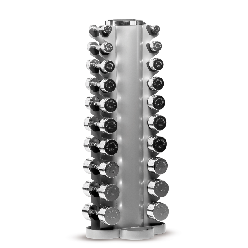 Прочность и Надежность: Изготовленная из высококачественного хромированного металла, эта стойка надежно удерживает гантели от 1 до 10 кг. Вы можете быть уверены в ее прочности даже во время интенсивных тренировок.