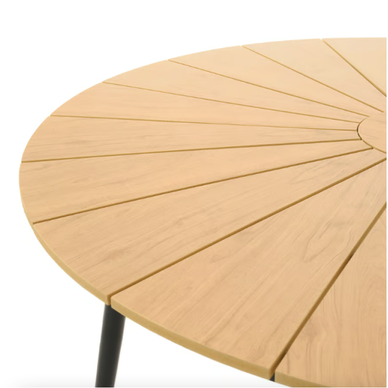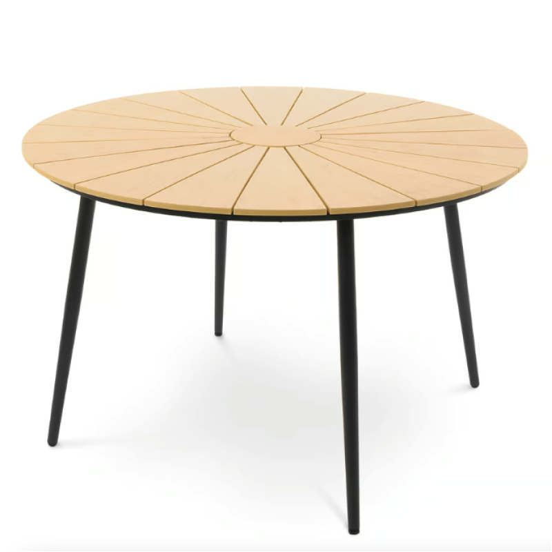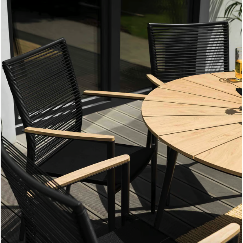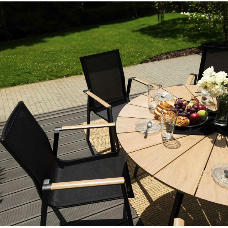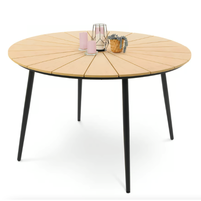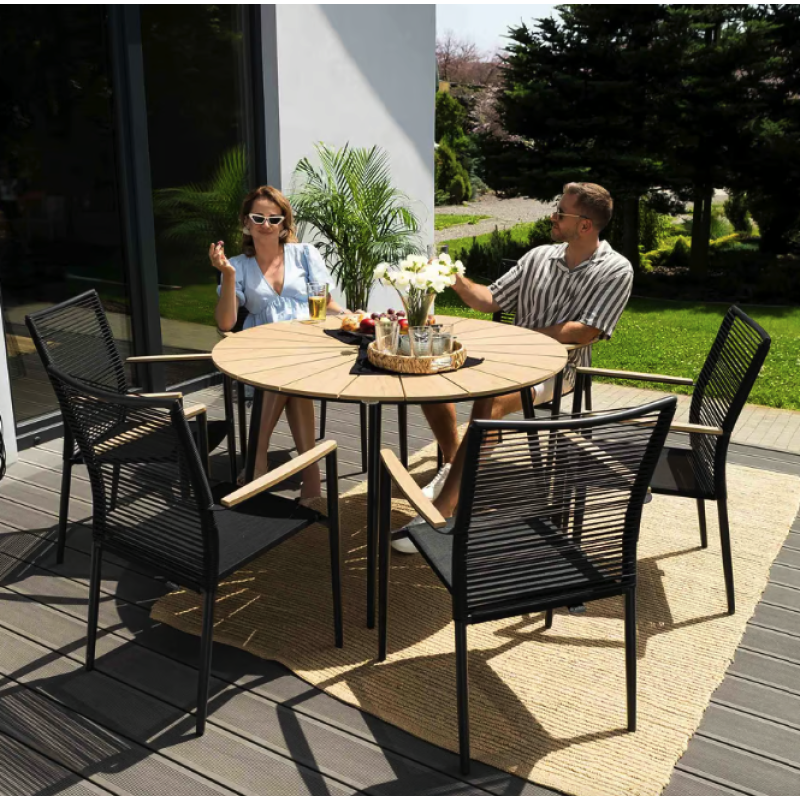 Садовый стол Palermo от Di Volio с круглой столешницей - это универсальный предмет мебели, который идеально подходит для обустройства сада, террасы или беседки. Сочетание прочной, но легкой алюминиевой конструкции с прочной столешницей из имитирующего дерево полиэтилена делает стол очень функциональным и устойчивым к погодным условиям. Современный дизайн, основанный на геометрических формах и сдержанных цветах в бежевых и черных оттенках, придает мебели универсальный характер, благодаря чему вы можете легко подобрать ее как к традиционным, так и к модернистским композициям, а также к другим элементам оборудования, например, стульям или саду зонтик.