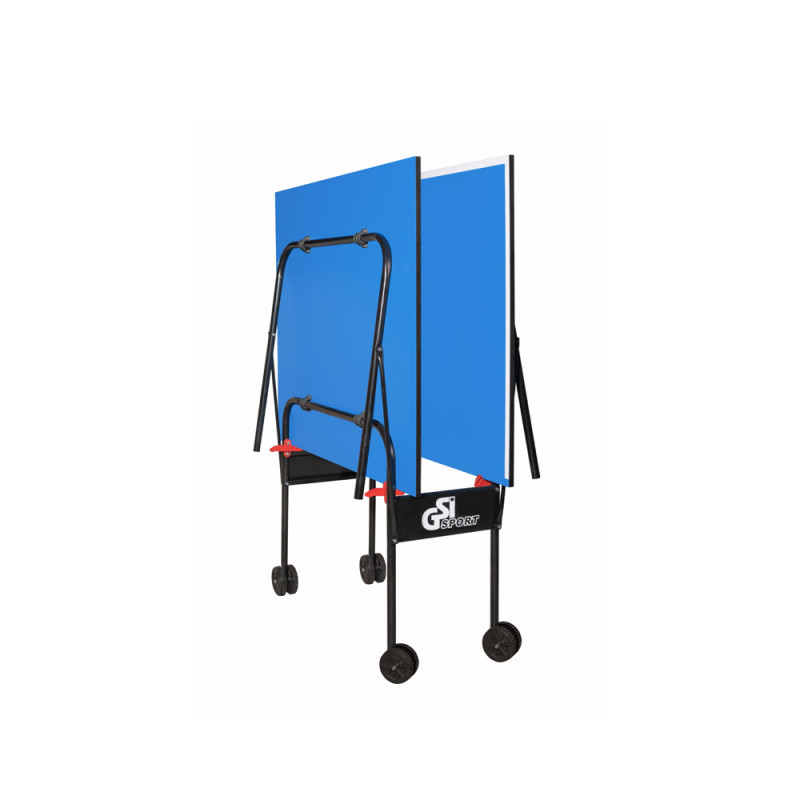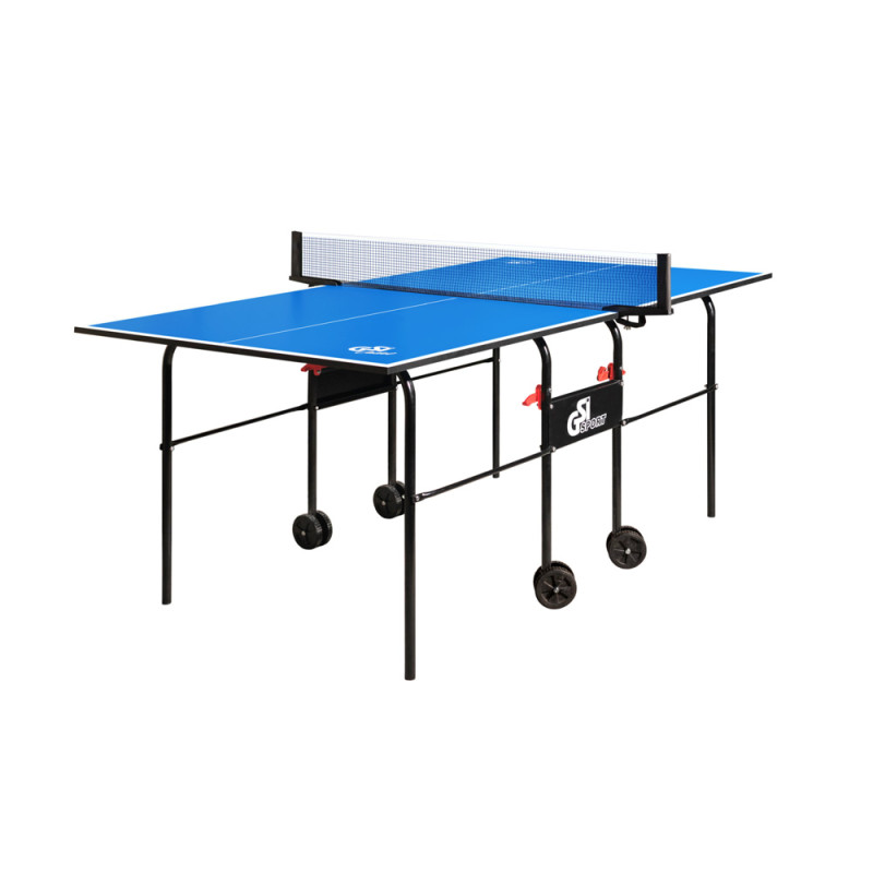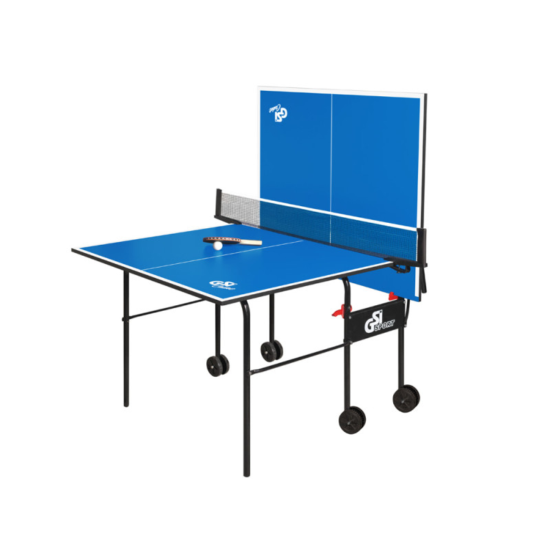 Теннисный стол для закрытых помещений. Компактные размеры позволяют разместить его даже в квартире, небольшом офисе и т.д., а конструкция системы сборки позволяет занимать минимальное пространство при хранении и максимально быстро наводить стол в игровое положение. В качестве материала для игровой поверхности используется специально обработанная древесностружечная плита (ДСП) толщиной 16 мм. На ДСП нанесено специальное антибликовое покрытие пластиковое покрытие синего цвета. Теннисный стол базируется на удобной тележке, изготовленной из металлического трубчатого профиля диаметром 25 мм с полиэфирным покрытием. Конструкция стола позволяет тренироваться самостоятельно. Стол легко перемещается на 4-х.