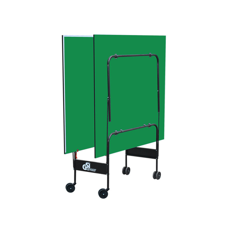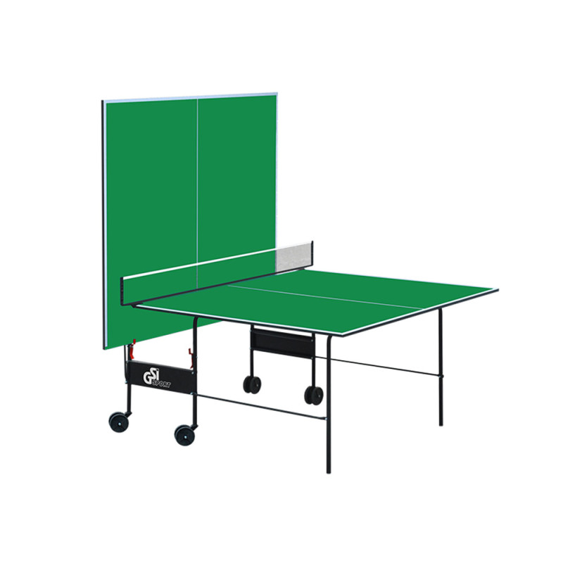 Теннисный стол для закрытых помещений. В качестве материала для игровой поверхности используется специально обработанная древесностружечная плита (ДСП) толщиной 16 мм. На ДСП нанесено специальное пластиковое антибликовое покрытие зеленого цвета. Теннисный стол базируется на удобной тележке, изготовленной из металлического трубчатого профиля диаметром 25 мм с полиэфирным покрытием. Конструкция стола позволяет тренироваться в одиночку. Стол легко перемещается на 4-х сдвоенных колесах диаметром 107 мм, 2 колеса маневренные.