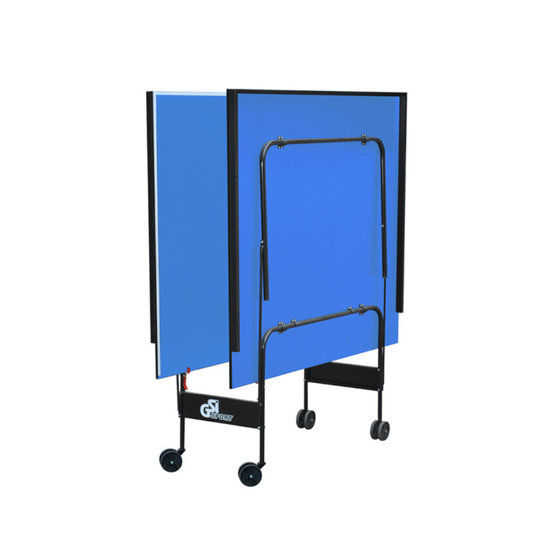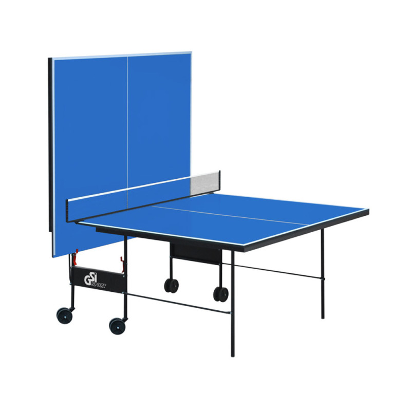Теннисный стол для закрытых помещений. В качестве материала для игровой поверхности используется специально обработанная древесностружечная плита (ДСП) толщиной 18 мм. На ДСП нанесено специальное антибликовое пластиковое покрытие синего цвета. Игровая поверхность оснащена металлической рамой (прямоугольный профиль 30*20 мм). Теннисный стол базируется на удобной тележке, изготовленной из металлического трубчатого профиля диаметром 25 мм с полиэфирным покрытием. Конструкция стола позволяет тренироваться в одиночку. Стол легко перемещается на 4-х сдвоенных колесах диаметром 107 мм, 2 колеса маневренные. Стол комплектуется сеткой.