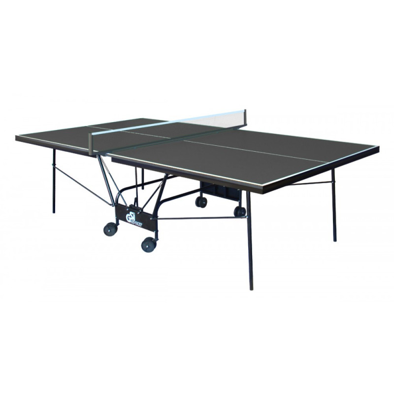 Теннисный стол для закрытых помещений. В качестве материала для игровой поверхности используется специально обработанная древесностружечная плита (ДСП) толщиной 16 мм. На ДСП нанесено специальное антибликовое пластиковое покрытие графитого цвета. Игровая поверхность оснащена металлической рамой (прямоугольный профиль 30*20 мм). Теннисный стол базируется на компактной удобной тележке, изготовленной из металлического трубчатого профиля диаметром 25 мм с полиэфирным покрытием. Конструкция стола позволяет тренироваться в одиночку. Стол легко перемещается на 4-х сдвоенных колесах диаметром 107 мм, 2 колеса маневренные.