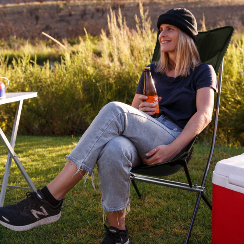 Сидіння з високою спинкою пошито з тканини Оксфорд ріп-стоп 600D, стійкої до розривів та появи зачіпок. Дизайн доповнений бічними вставками із сітки, яка покращує циркуляцію повітря в області спини та запобігає зайвому потовиділенню під час відпочинку спекотного дня.
