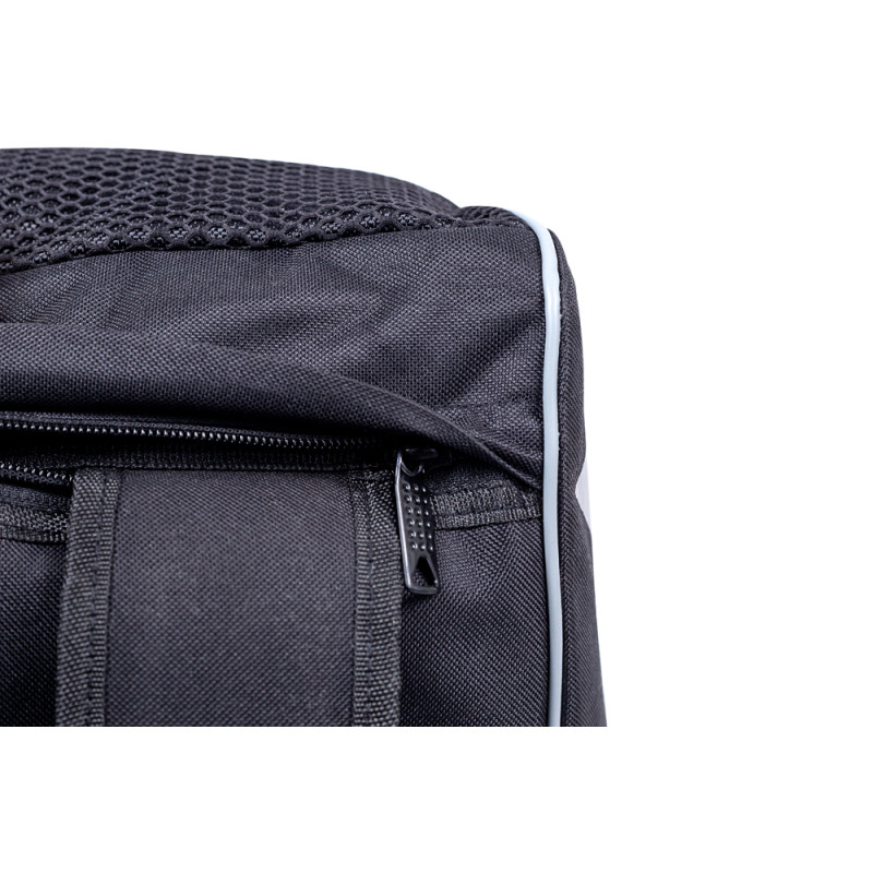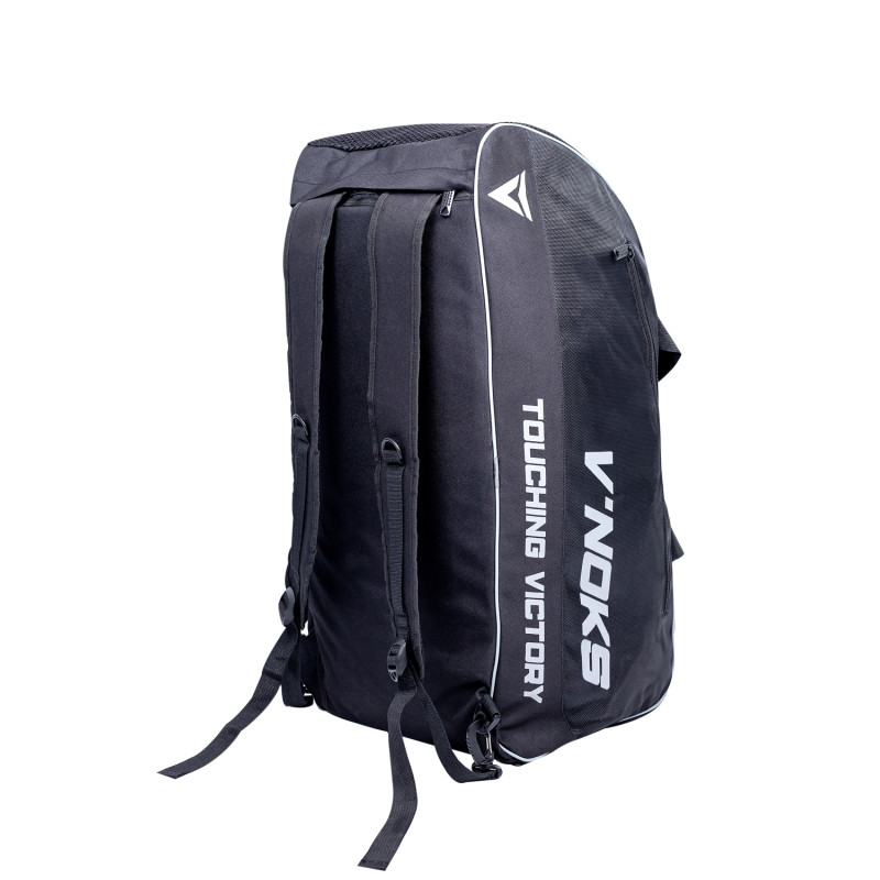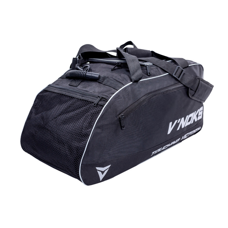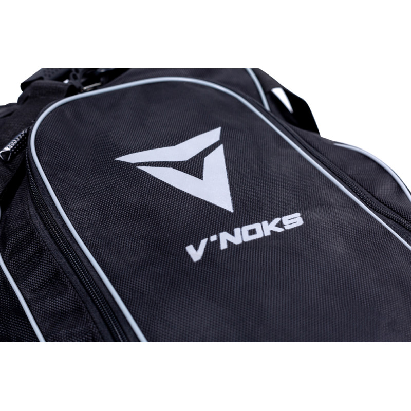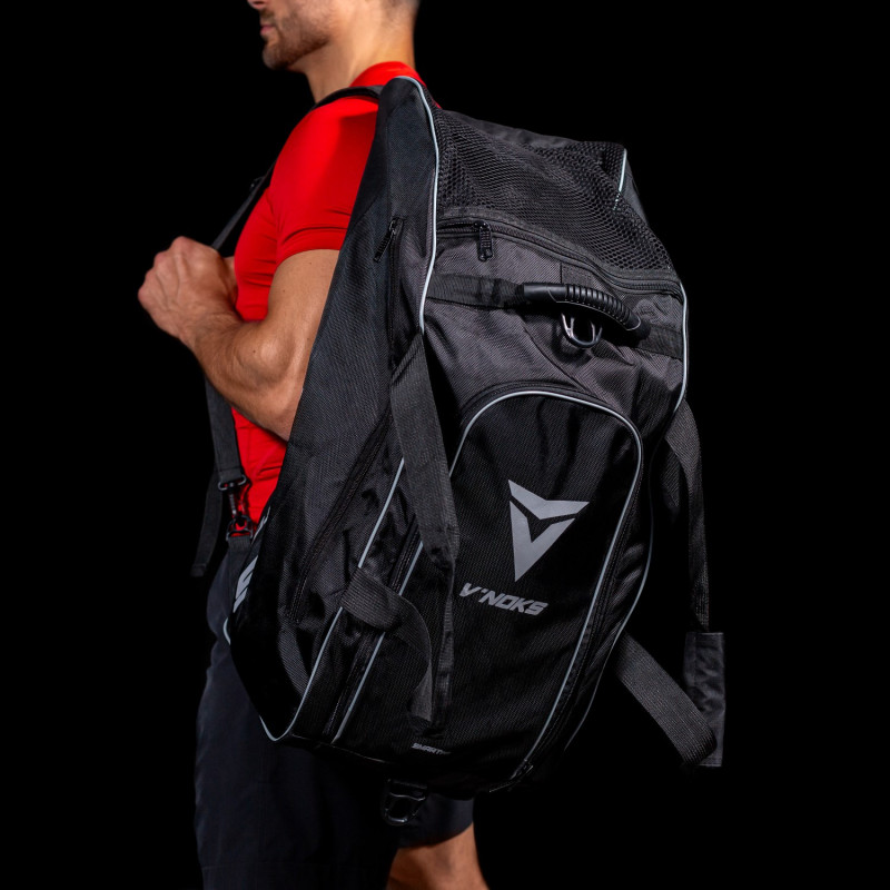 Сумка-рюкзак V`Noks PRO може використовуватися як рюкзак або сумка. Склад: нейлон та сітка. Лямки рюкзака можна приховати за подвійним дном. Головне відділення застібається на U-подібну блискавку-замок. З боків знаходяться лямки зі зручною рукояткою і знімний ремінь. Також є бокова кишеня на блискавці. У торцях сумки знаходяться: кишеня з сітки на блискавці з одного боку, відділення на блискавці для взуття - з іншого. Для зручності, зверху знаходиться додаткова прогумована ручка. Сумка-рюкзак вміщає до 46 літрів. Довжина (по дну) - 65 см, ширина - 28 см.