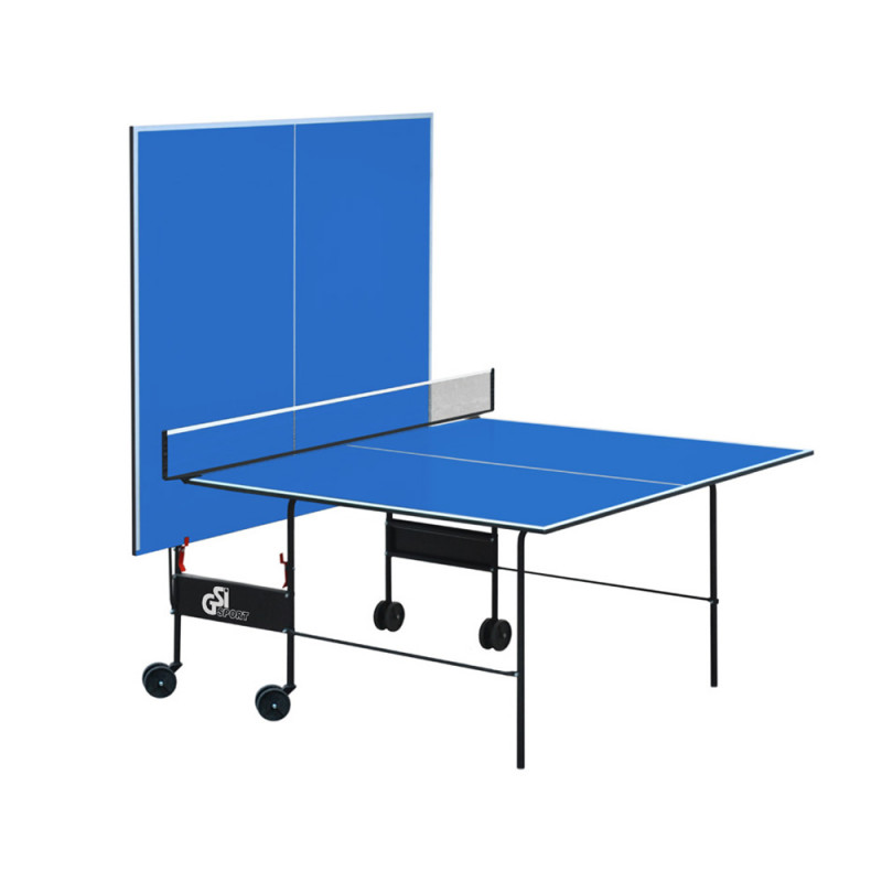 Теннисный стол для закрытых помещений. В качестве материала для игровой поверхности используется специально обработанная древесностружечная плита (ДСП) толщиной 16 мм. На ДСП нанесено специальное антибликовое пластиковое покрытие синего цвета. Каждая половина столешницы имеет независимую разборную конструкцию и базируется на четырех складывающихся ножках, имеющих жесткие фиксаторы в игровом положении. Конструкция изготовлена из металлического трубчатого профиля диаметром 25 мм с полиэфирным покрытием.